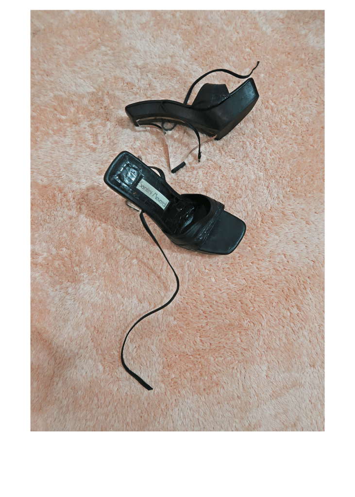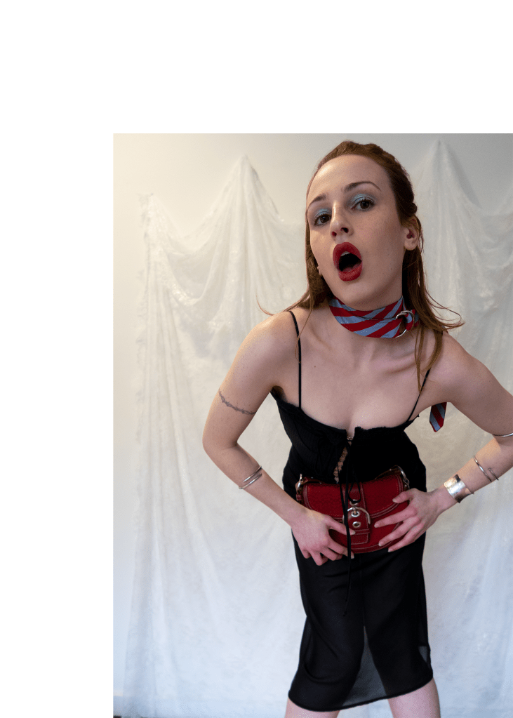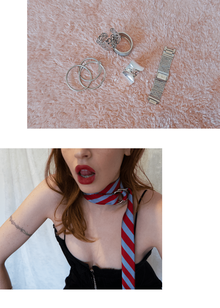 90s betsey johnson corset with sheer black midi skirt, paired with an array of silver cuff bracelets, a striped tie belt worn as a choker, 90s clear wedges & a vintage red coach bag as a clutch.