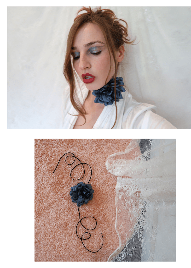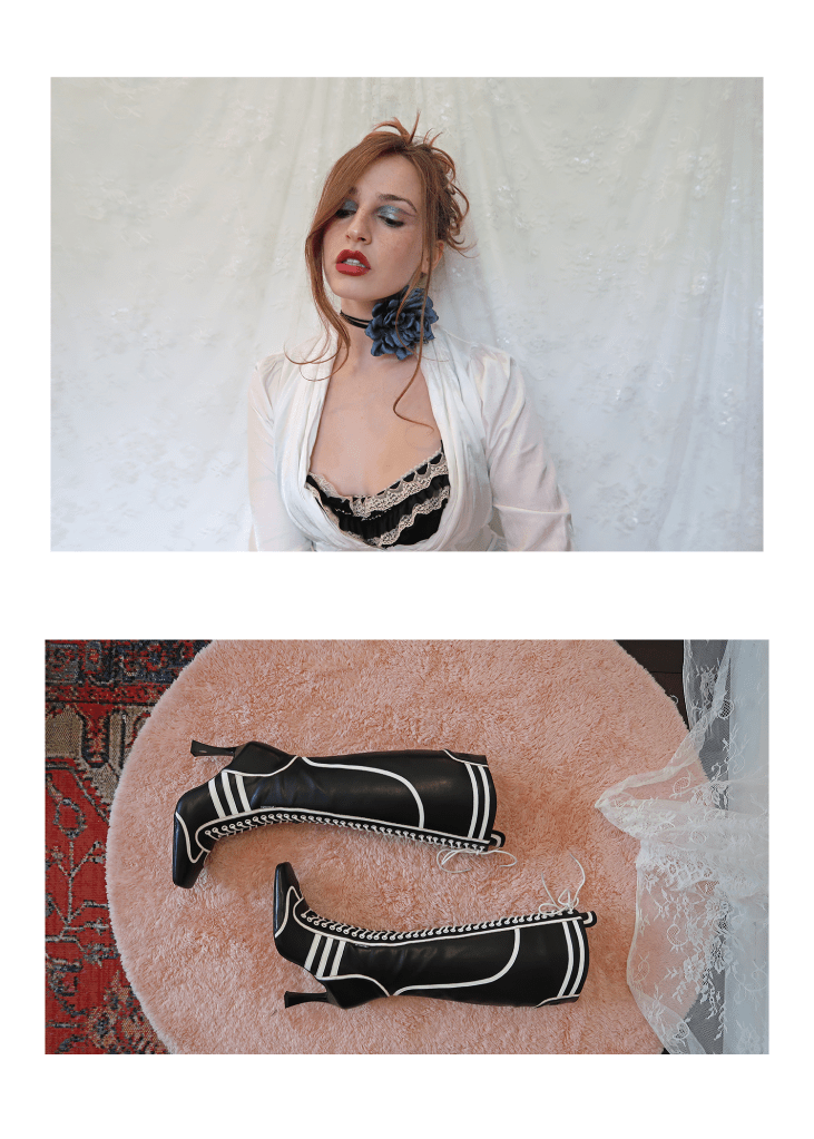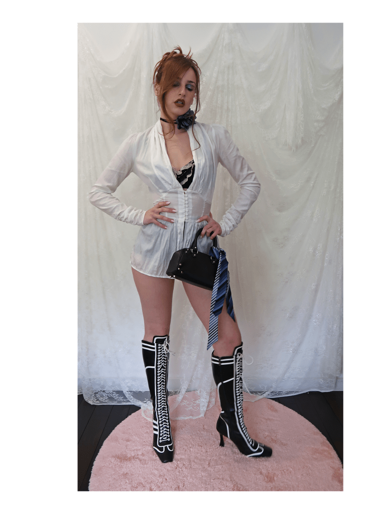 WHITE CINCHED HI-LOW BLOUSE WITH A VINTAGE FRILLY RUFFLE BRA PEEPING OUT, STYLED WITH CHEEKY BLACK HOT SHORTS, NIIHAI BOXER BOOTS, A BLUE FLOWER CHOKER & A BLACK LEATHER BOWLER BAG DECORATED WITH BLUE STRIPED TIES.