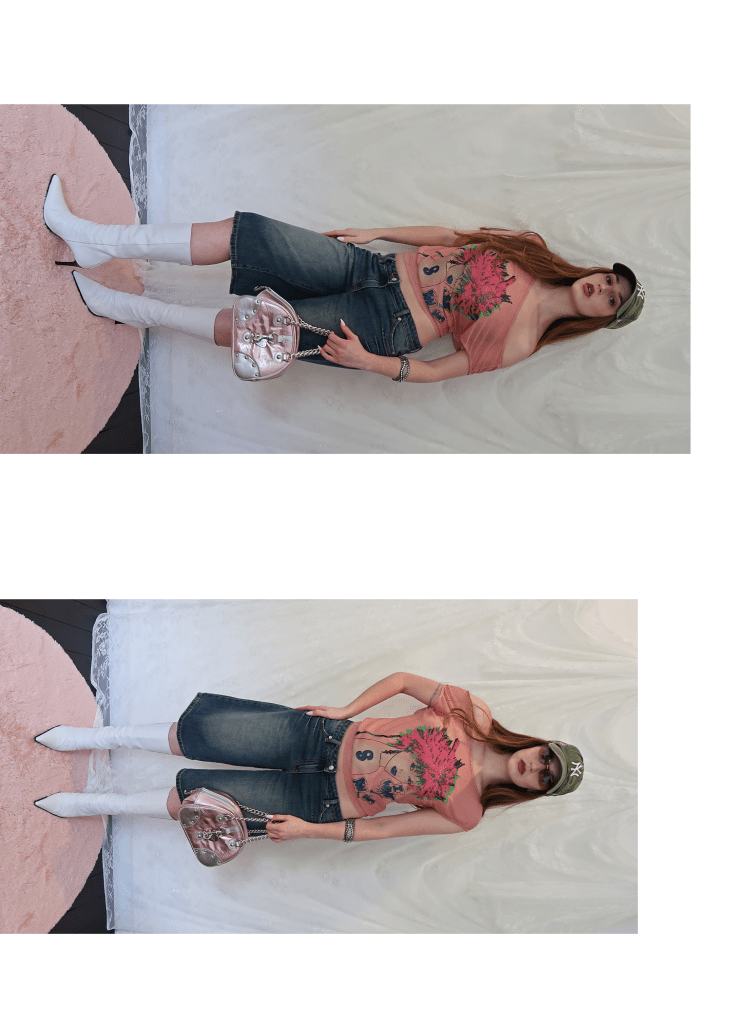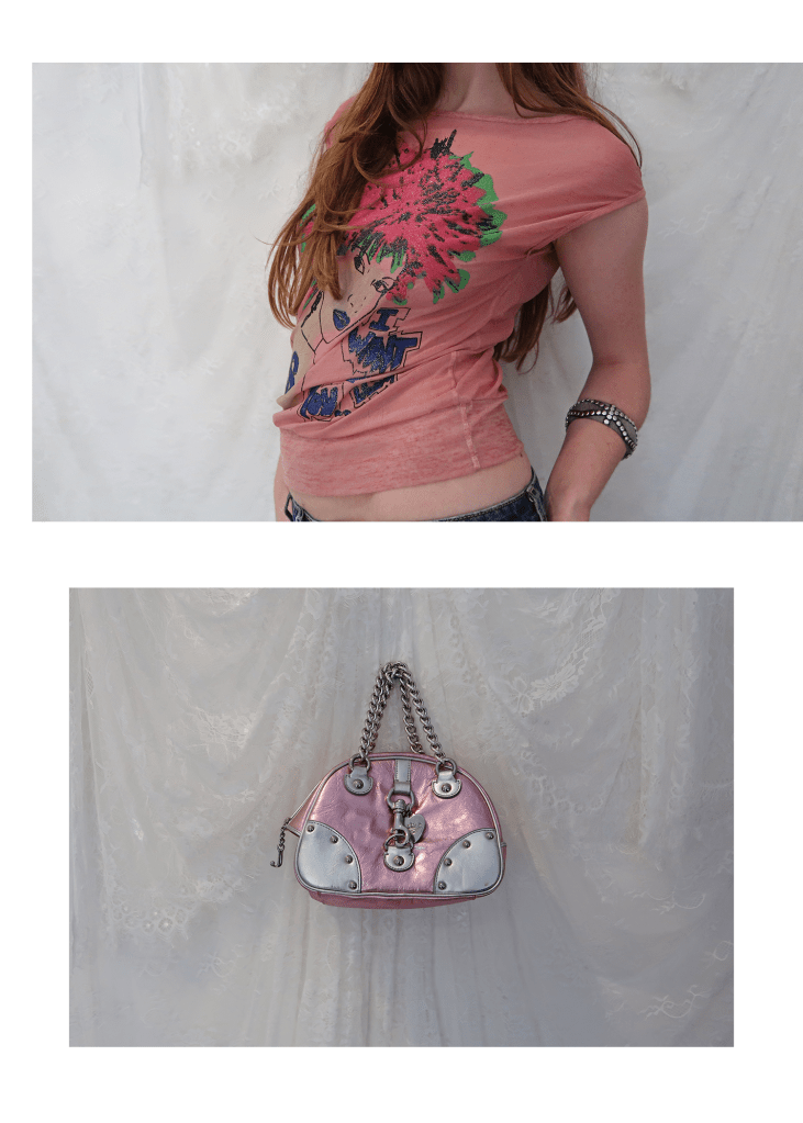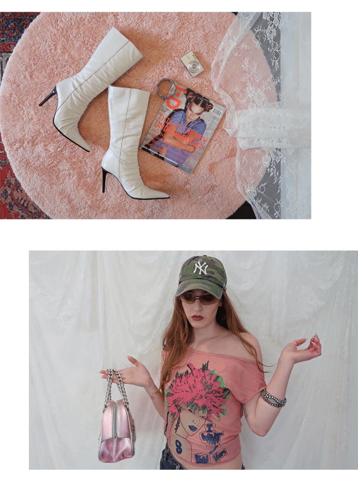 ‘I WANT YOU’ GRAPHIC TEE WITH I.AM.GIA. BAGGY DENIM SHORTS, PAIRED WITH VINTAGE BEBE WHITE SCRUNCH BOOTS, CAMO ‘NY’ BASEBALL HAT, STUDDED CUFF BRACELET, A 2000S-ERA JUICY COUTURE BOWLER BAG & VINTAGE CHANEL RIMLESS SUNGLASSES.