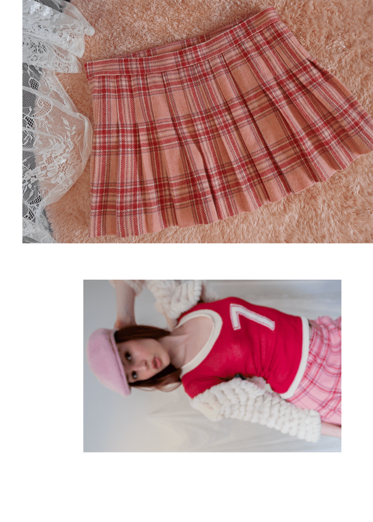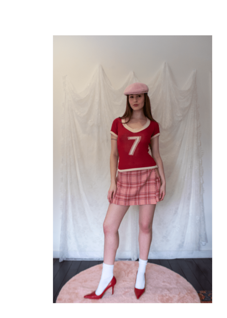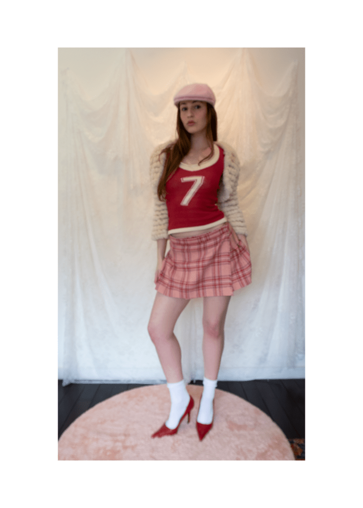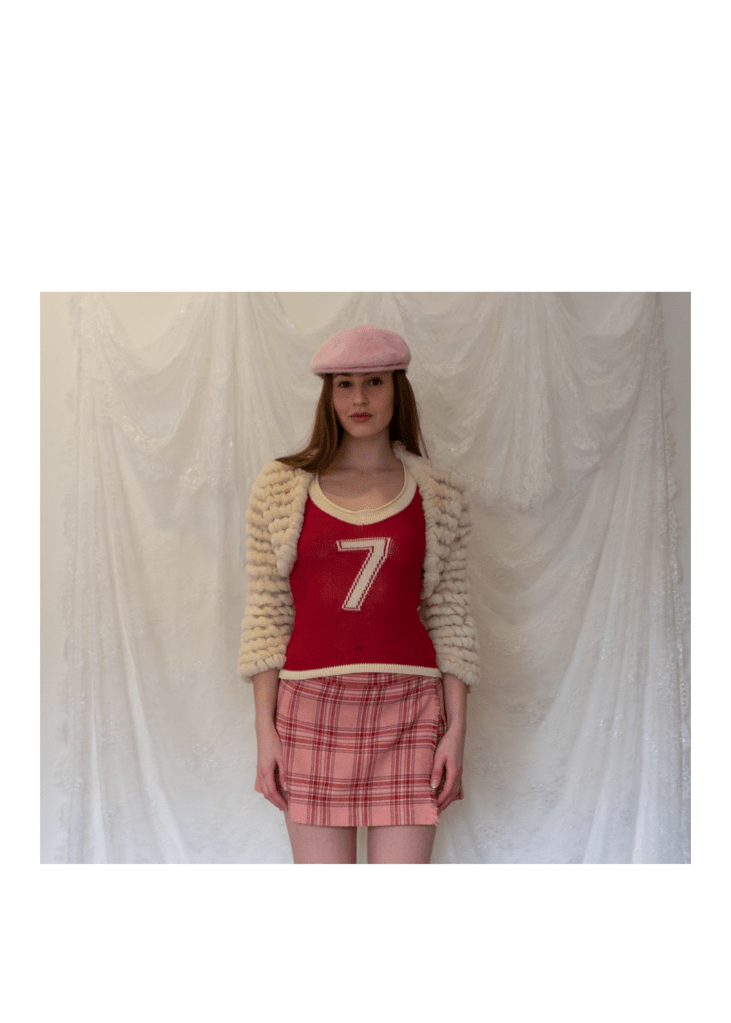 knit jersey top with vintage rabbit fur bolero, paired with juicy couture plaid miniskirt, pink angora kangol cap, white crew socks and red leather pumps.