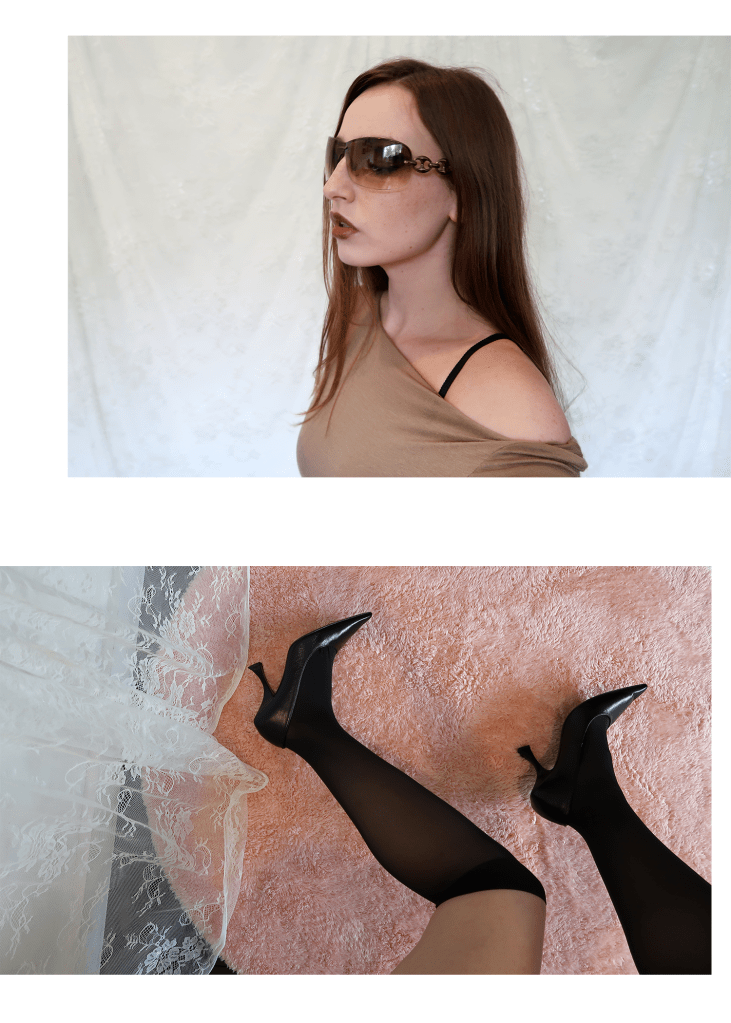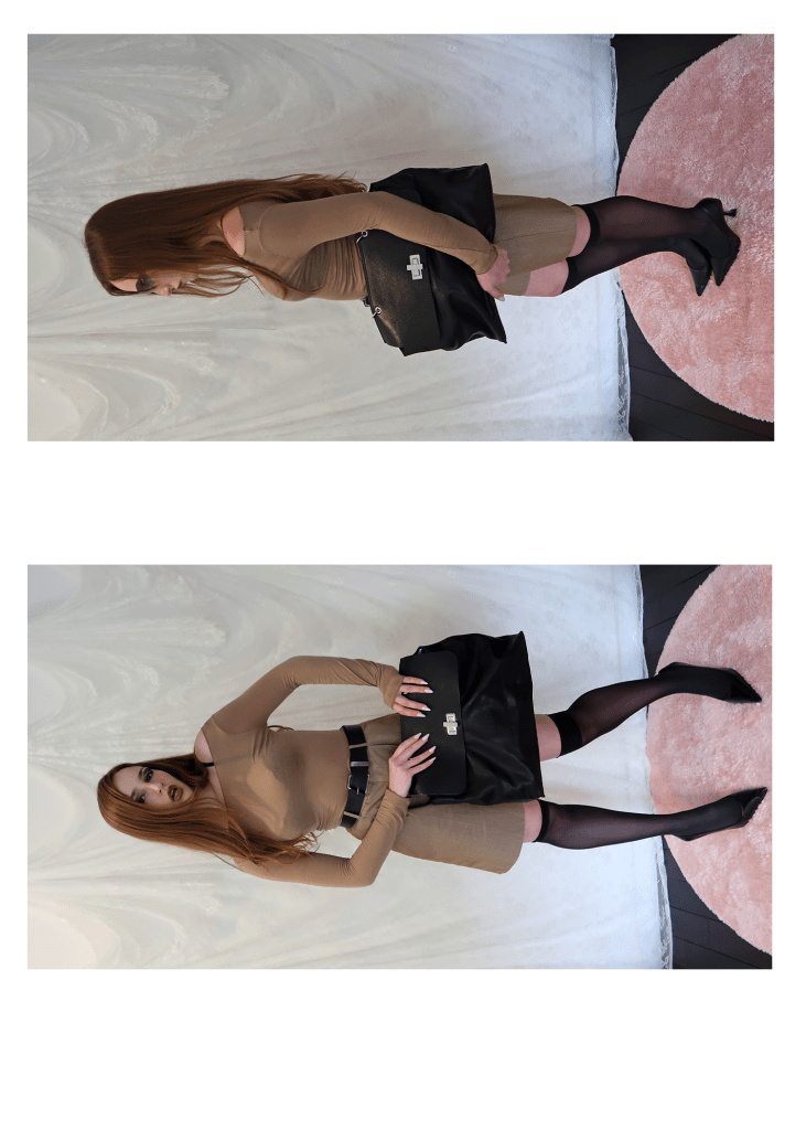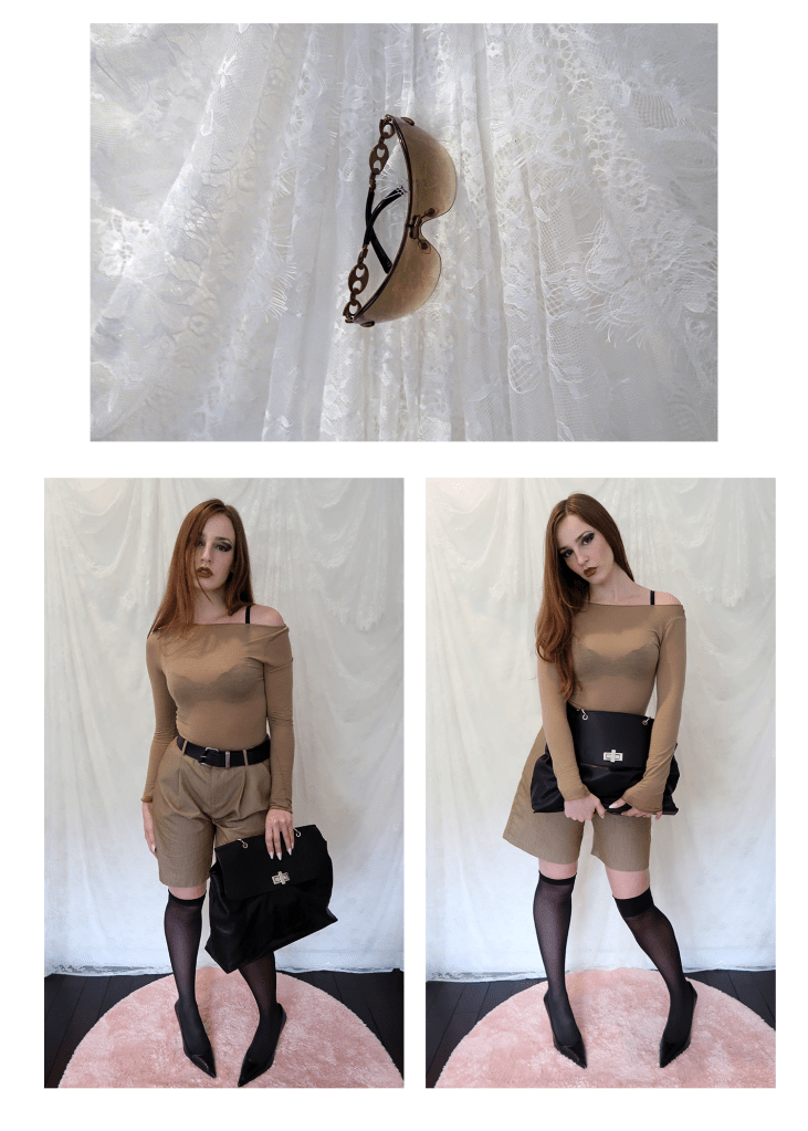 SHEER TAN INTIMISSI KNIT TOP LAYERED OVER A BLACK LACE BRA AND TUCKED-IN TO A PAIR OF TAN BERMUDA SHORTS, PAIRED WITH A BLACK LEATHER BELT, SHEER BLACK KNEE-HIGH STOCKINGS, BY FAR CREASED LEATHER PUMPS, AN ITALIAN LEATHER CLUTCH & VINTAGE GUCCI SHIELD SUNGLASSES.