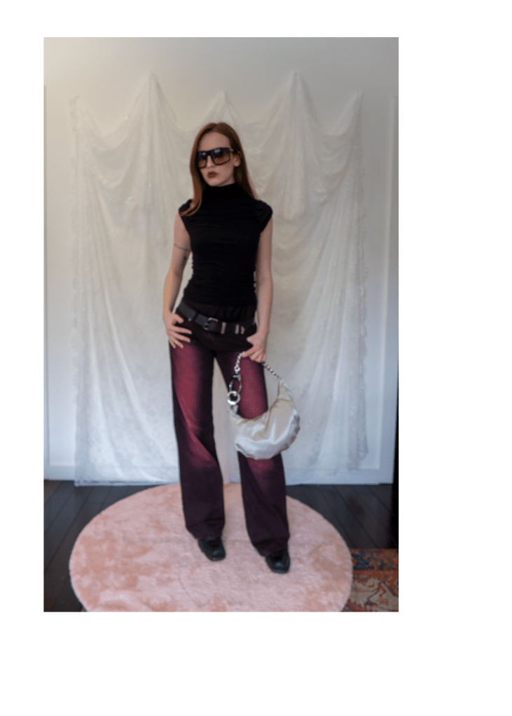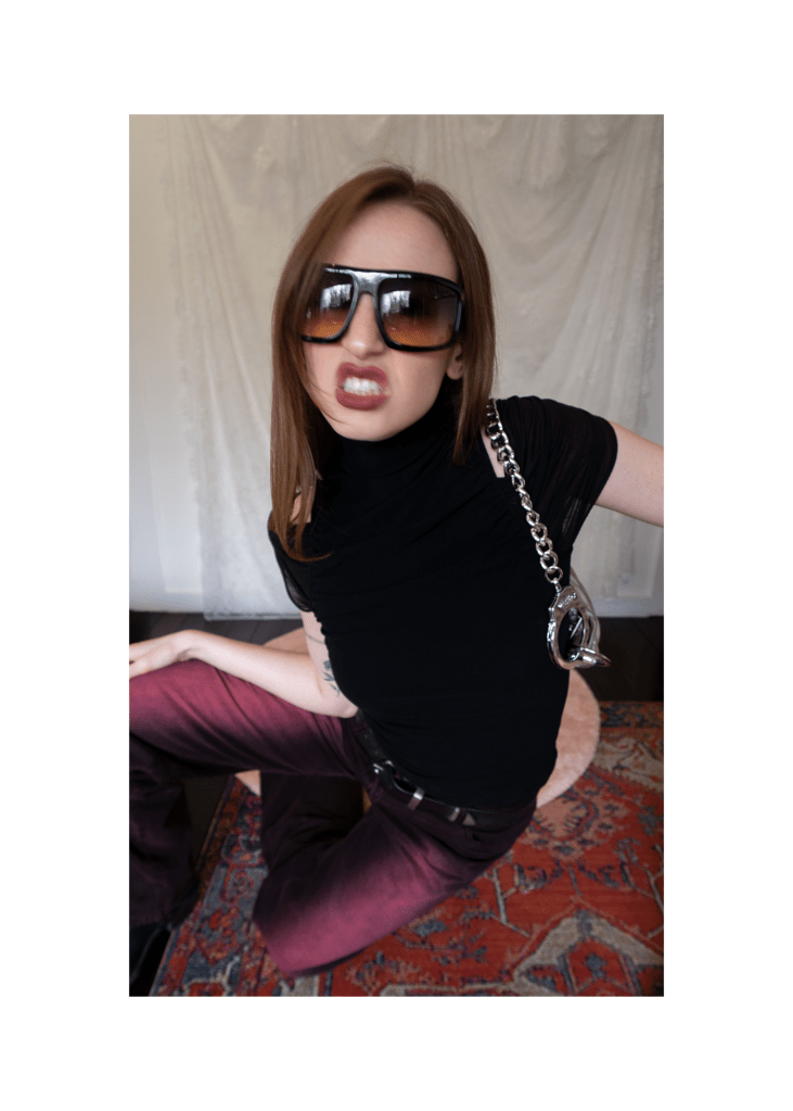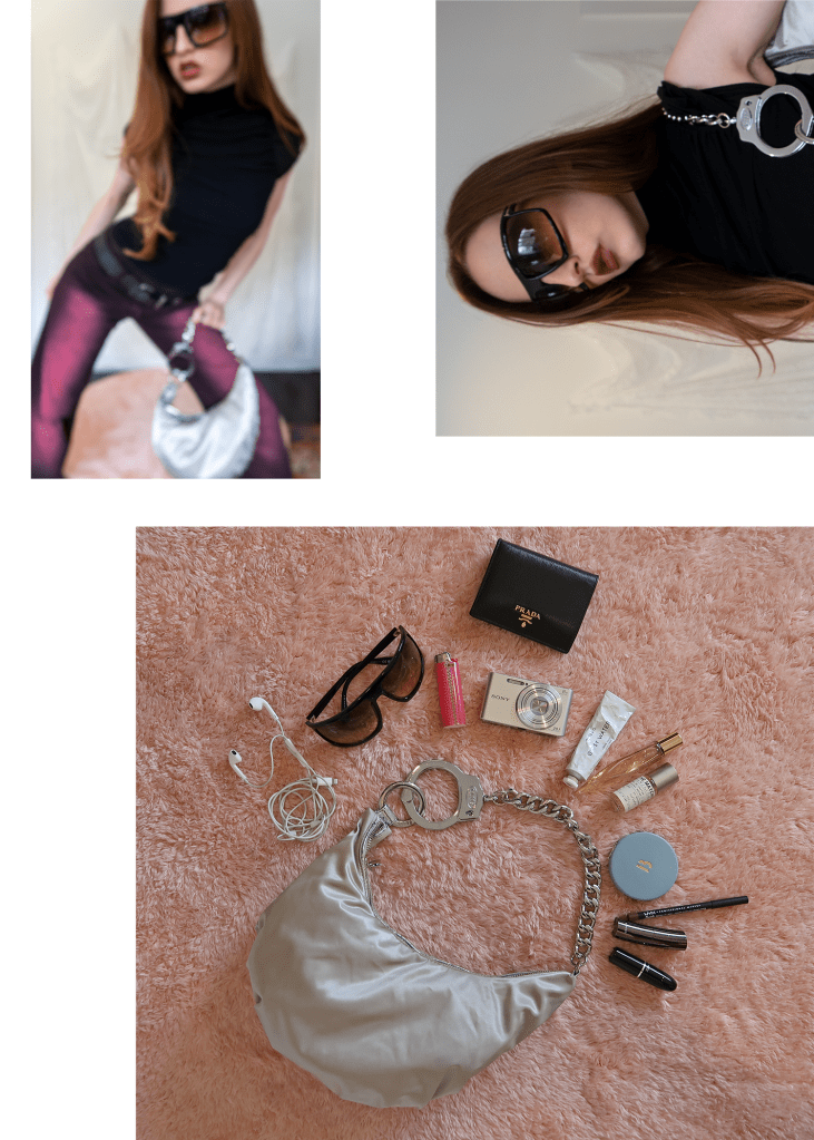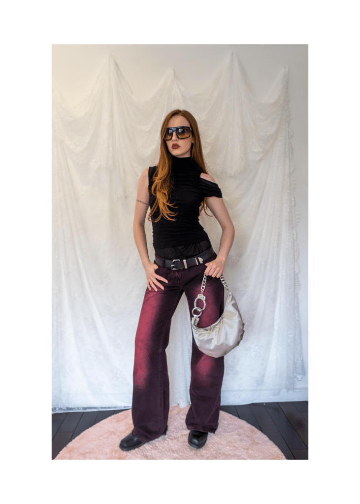 vintage helmut lang top layered under ruched mesh turtleneck, paired with I.AM.gia red wash jeans, a black leather belt, frye harness boots, tom ford sunglasses and the iconic cuffz by linz bag.